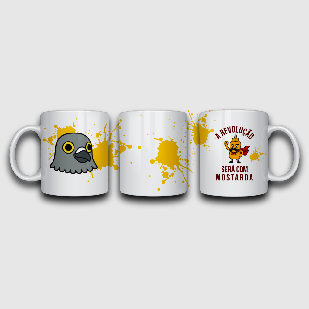 Do outro lado da caneca, a estampa da mostarda revolucionária declara o manifesto: simples, direta e com cheiro de mudança.
