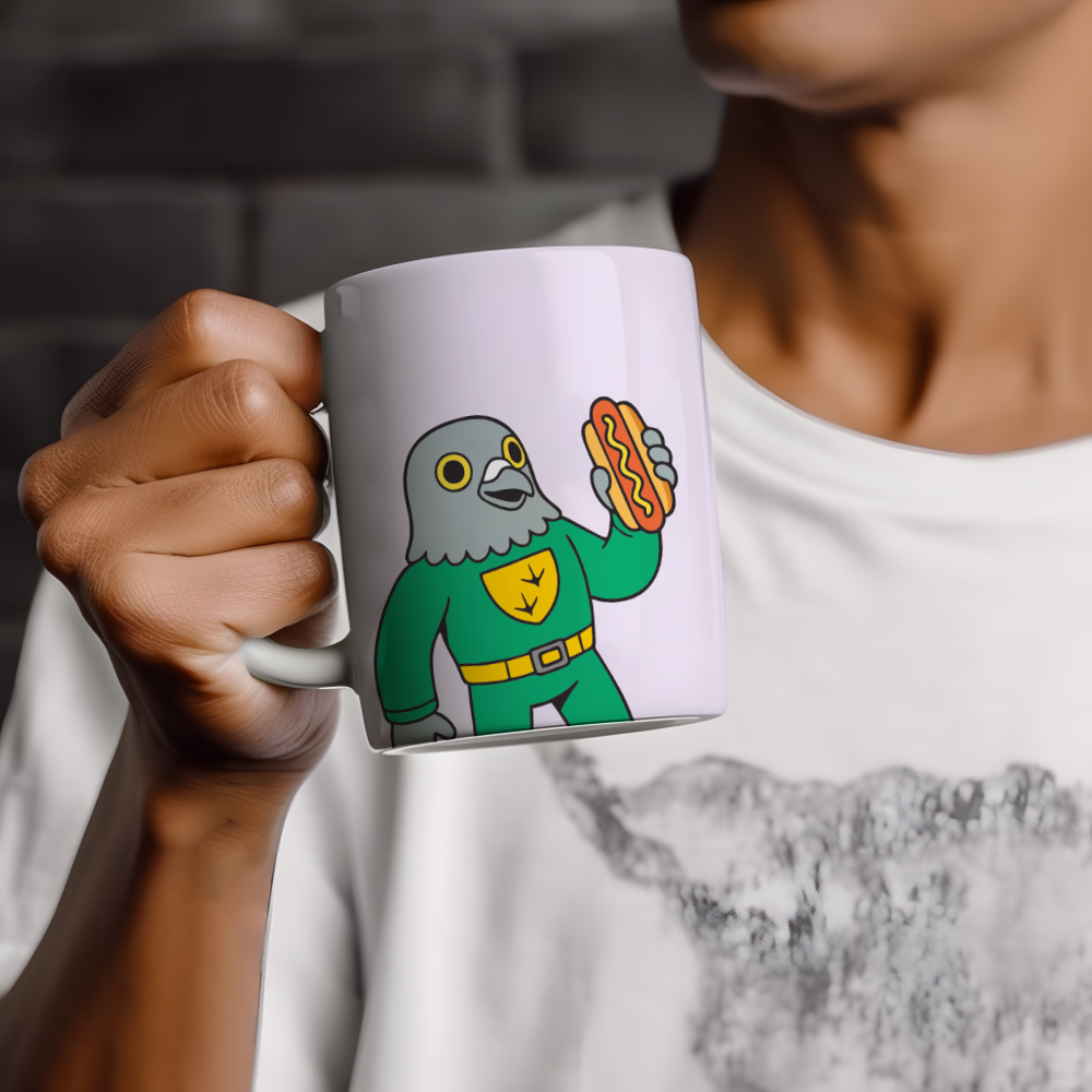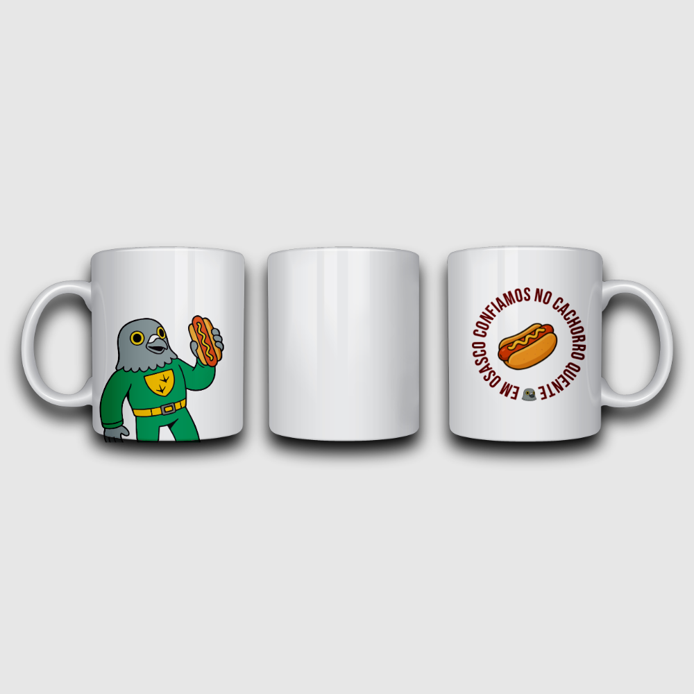 Se existe uma divindade urbana capaz de proteger seus lanches e abençoar suas madrugadas, esse ser é Pombo Clóvis, o oráculo cinzento das praças de Osasco. Nesta caneca, você encontra o imponente pombo Clóvis de um lado com aquele olhar de quem sabe todos os segredos da cidade  e do outro, a frase que guia toda uma civilização gastronômica: “Em Osasco confiamos no cachorro quente.”